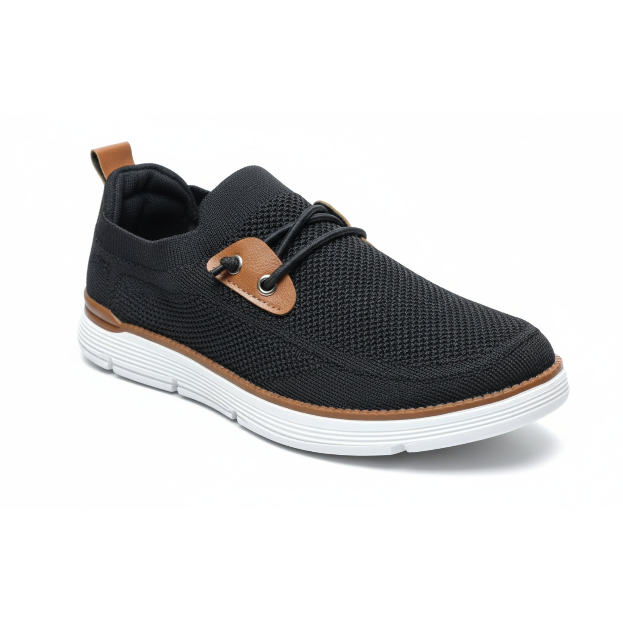 Upgrade your everyday look with these black lace-up sneakers featuring a breathable knit mesh upper and stylish brown leatherette accents. Designed for all-day comfort and versatile wear, these shoes blend casual elegance with durability. The lightweight white sole ensures flexibility, making them perfect for work, travel, or daily casual outfits.