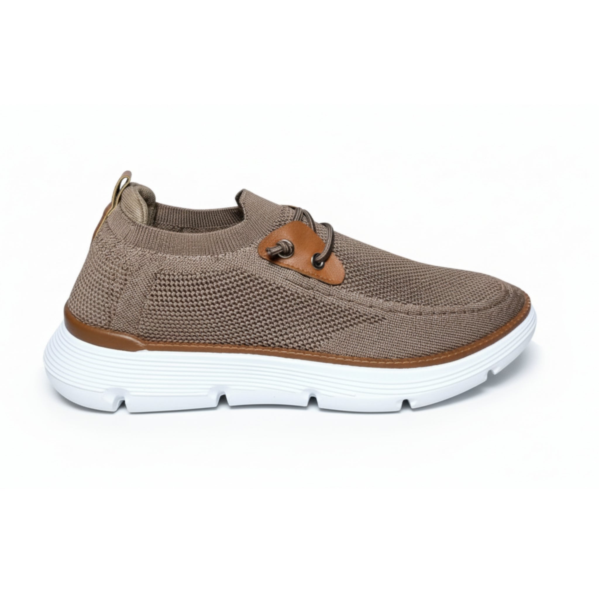 Upgrade your everyday look with these brown lace-up sneakers featuring a breathable knit mesh upper and stylish brown leatherette accents. Designed for all-day comfort and versatile wear, these shoes blend casual elegance with durability. The lightweight white sole ensures flexibility, making them perfect for work, travel, or daily casual outfits.